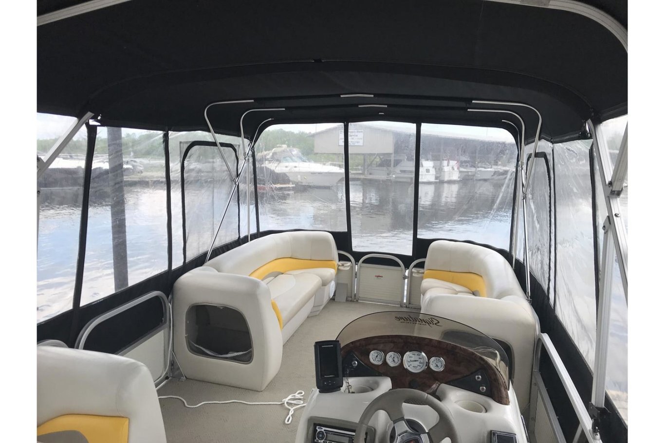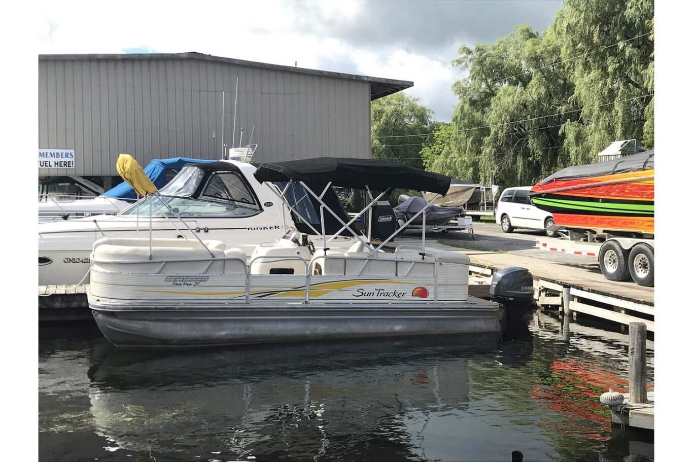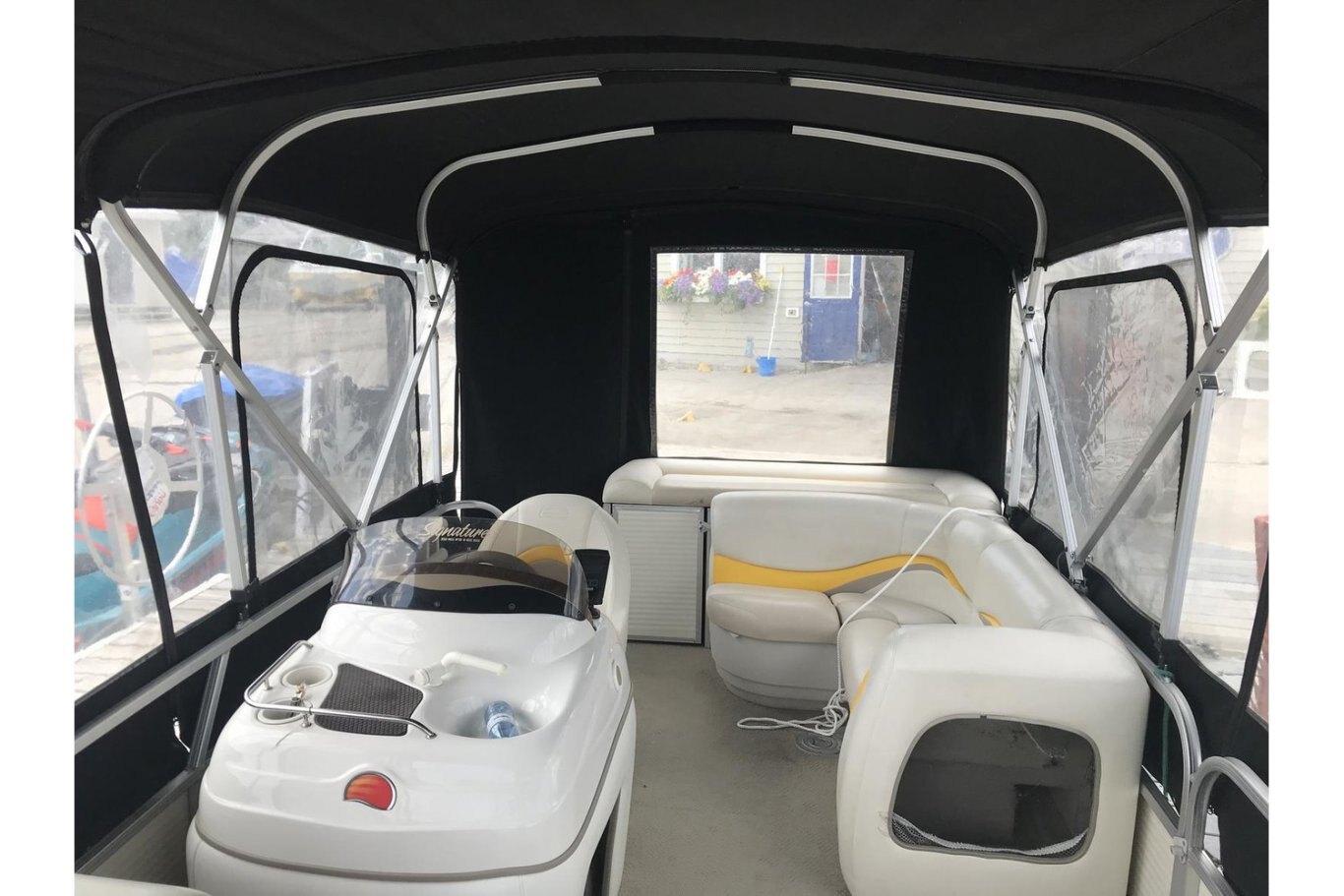 Tracker 21 Party Barge, Powered by a Yamaha 115hp Outboard. Has spacious wrap around seating for you and all your friends, Table, Private Change room, and a full camper top.